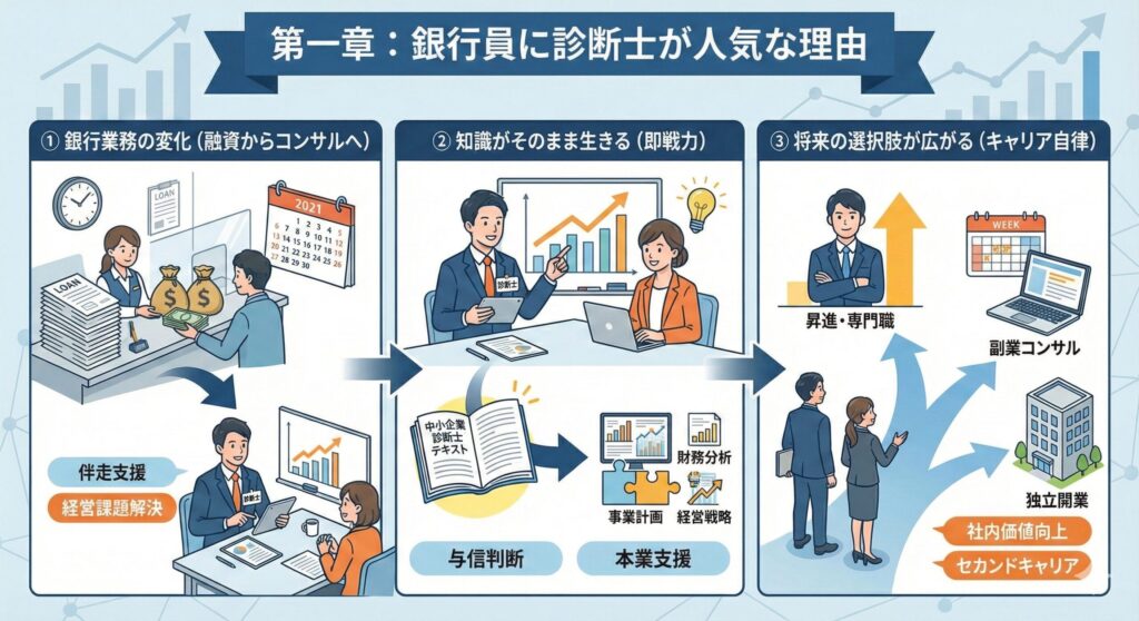 その背景には、銀行業務の変化・診断士の知識がそのまま現場で役立つ・転職するにも有利という“圧倒的な相性の良さ”があります。