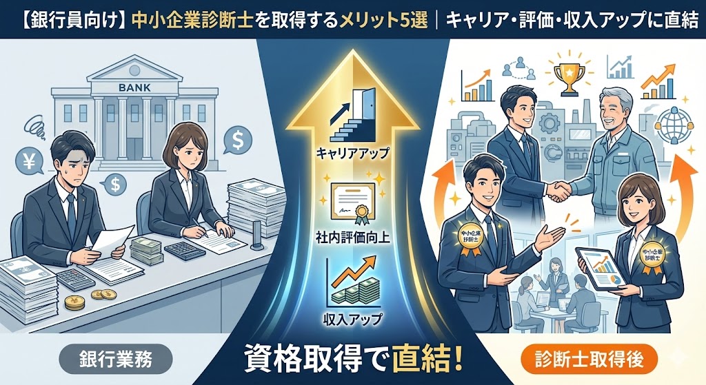 今回は、「【銀行員向け】中小企業診断士を取得するメリット5選|キャリア・評価・収入アップに直結」というタイトルで解説しました。
