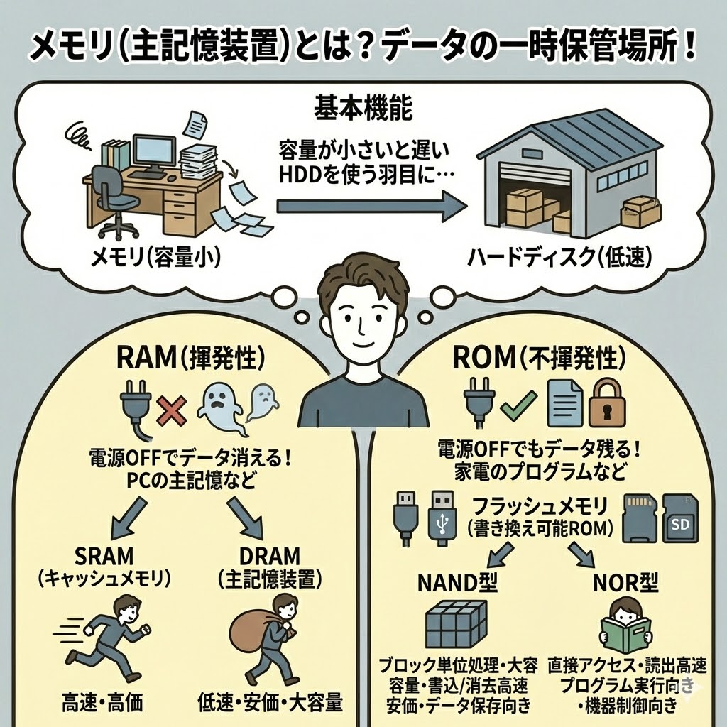 メモリ(主記憶装置)とハードディスク(補助記憶装置)がある。