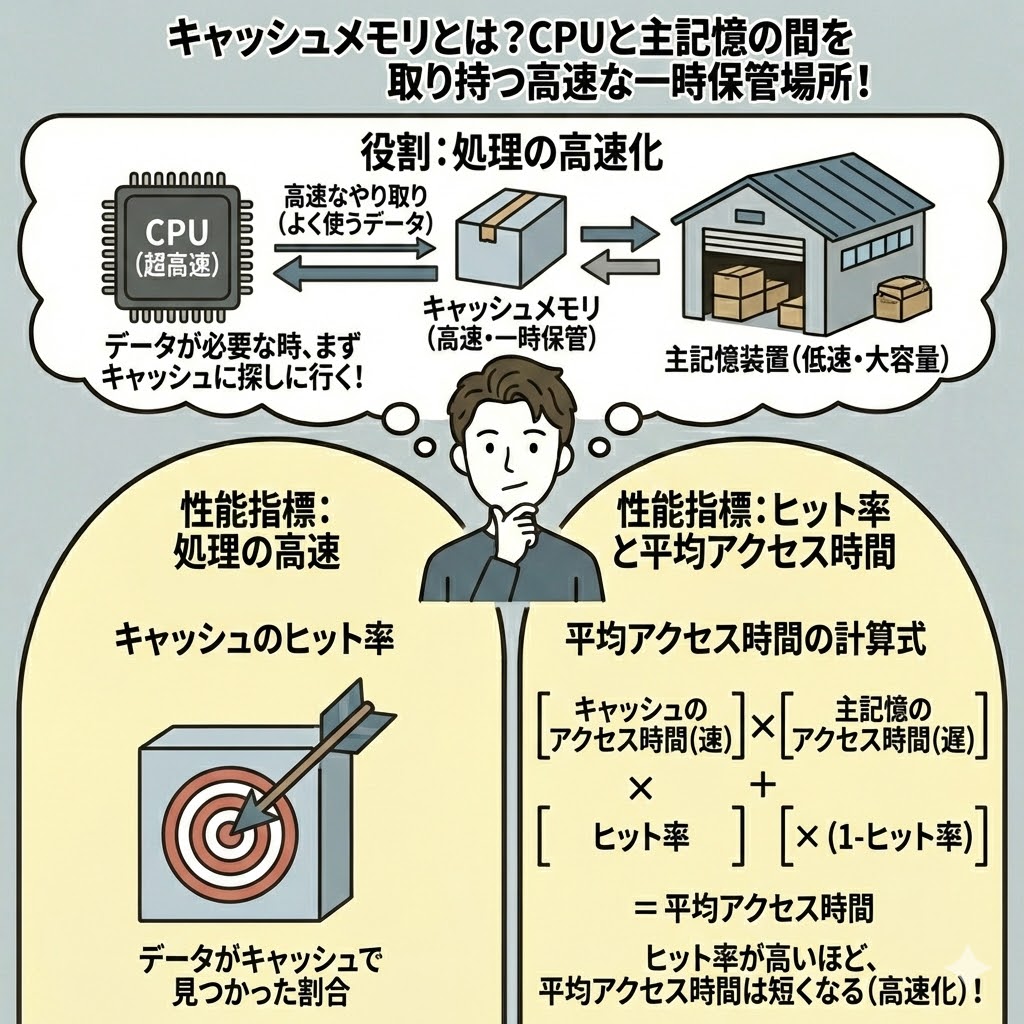 ちなみに、キャッシュメモリはメモリ(主記憶装置)よりも高速にアクセスできます。