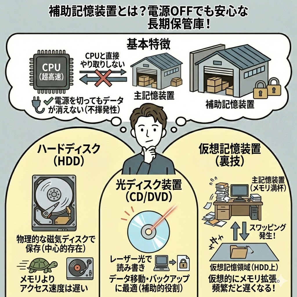 メモリ(主記憶装置)に比べて速度は遅いですが、安価・電源を消しても消去されないのが特徴。