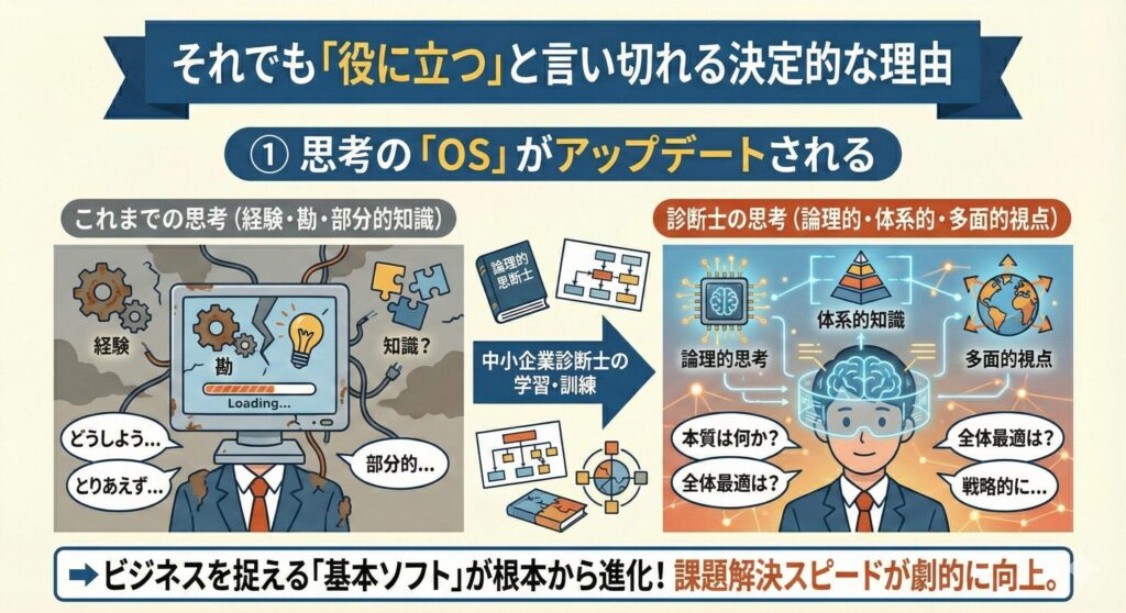 しかし、中小企業診断士の学習を通じて、経営戦略、財務、マーケティング、運営管理などを横断的かつ体系的に学ぶことで、あなたの脳内OSは劇的にアップデートされます。