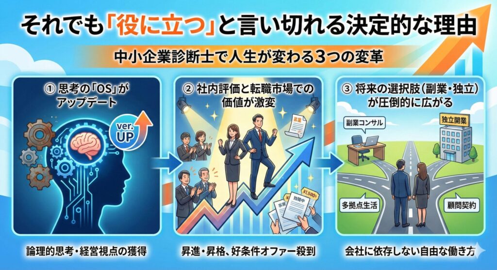 ここまでお話しした通り、中小企業診断士は「思考のOSをアップデート」し、あなたのキャリアを劇的に変えるポテンシャルを秘めています。