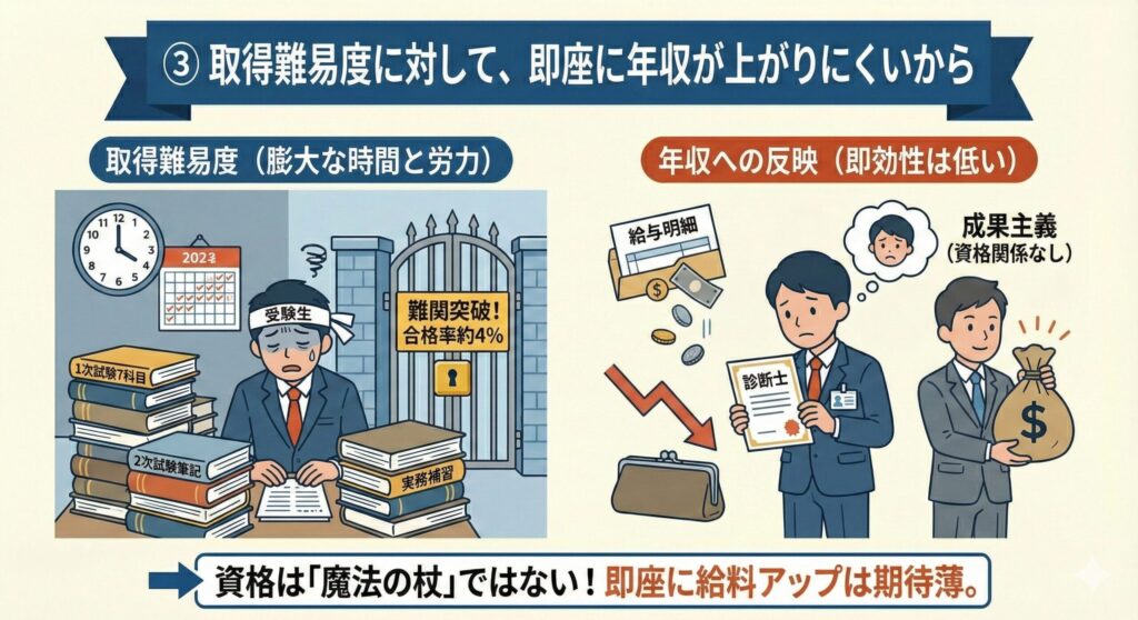 3つ目の理由は「取得難易度に対して、即座に年収が上がりにくいから」です。